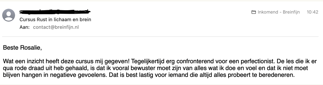 Een paar maanden geleden werd ik getipt op jouw online-training Rust in lichaam en brein, en heb ik diezelfde dag geboekt. Dit is met afstand het beste dat ik afgelopen jaar gedaan heb. Al de andere therapeuten (ook bedrijfsarts en psycholoog) hebben wel een beetje geholpen, maar jouw cursus slaat de spijker op z’n kop. Dit is precies waar ik last van heb en je weet dit (ondanks dat we elkaar nooit gesproken hebben) perfect aan te geven. Ik heb de cursus (ik heb er de tijd voor genomen…) in bijna 2 maanden helemaal doorlopen. Komende maanden ga ik de training zeker regelmatig terugkijken, want elke keer kom ik toch weer dingen tegen. Maar het belangrijkste is, dat ik veel meer rust heb gevonden dan ik in jaren geweest ben, en ik voel dat er nog veel meer ruimte tot verbetering is.