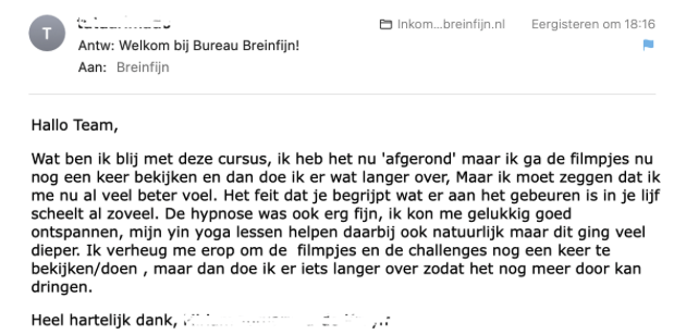 Als je binnen 2 modules (2 dagelijkse lessen) niet tevreden bent, dan krijg je je geld terug, zonder dat je een reden hoeft op te geven. Belangrijk is wel dat je binnen 2 dagen na betaling een mail stuurt naar team@breinfijn.nl, omdat we vanwege privacy redenen niet kunnen controleren wat je wel en niet hebt gevolgd.